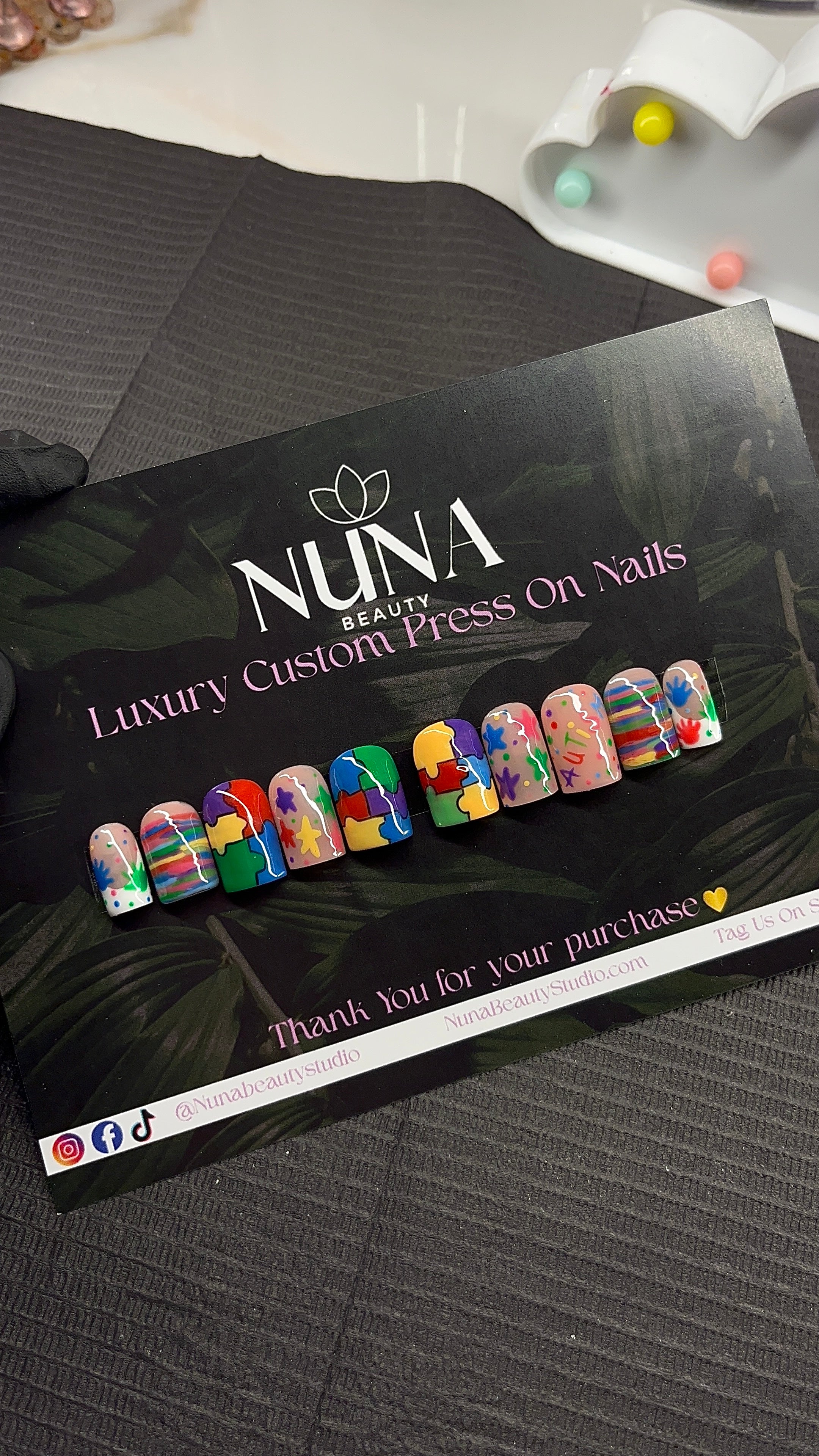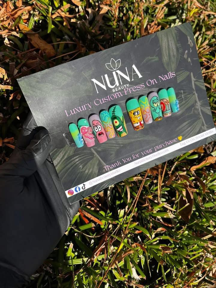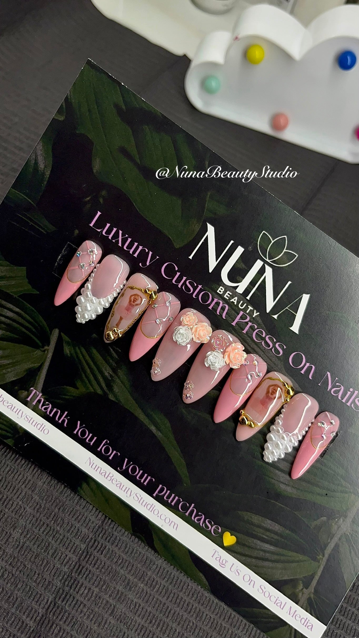 Each set is handcrafted by a nail technician using high-quality products such as acrylic or hard gel for strength, durability, and a salon-quality finish.