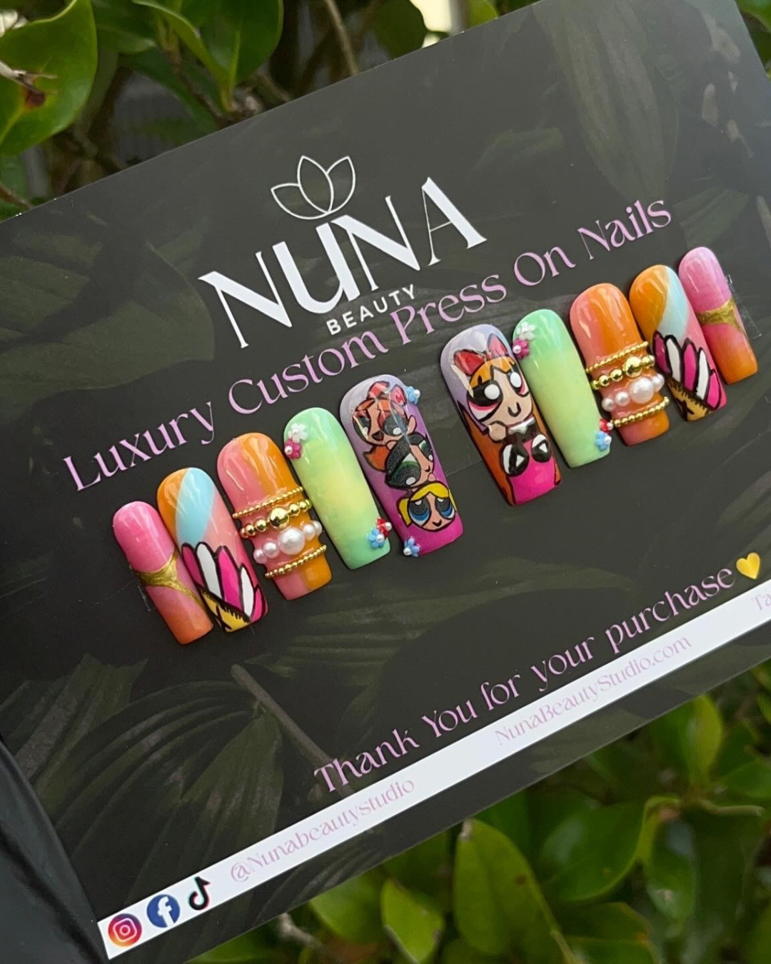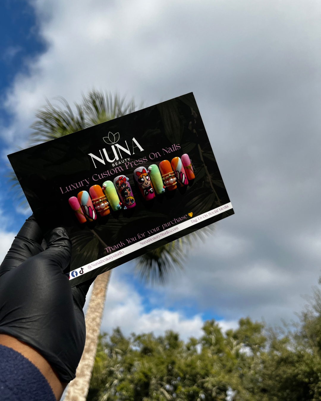 This bold and playful set features all three Powerpuff Girls — Blossom, Bubbles, and Buttercup — hand-painted with vibrant detail. Designed on trendy bangle-style nails, the set includes flower accents, luxe gold accent nails, and a statement Kaws Flower for the perfect mix of cute + edgy. A fun, high-quality collectible set for anyone who loves iconic character art and unique nail designs!