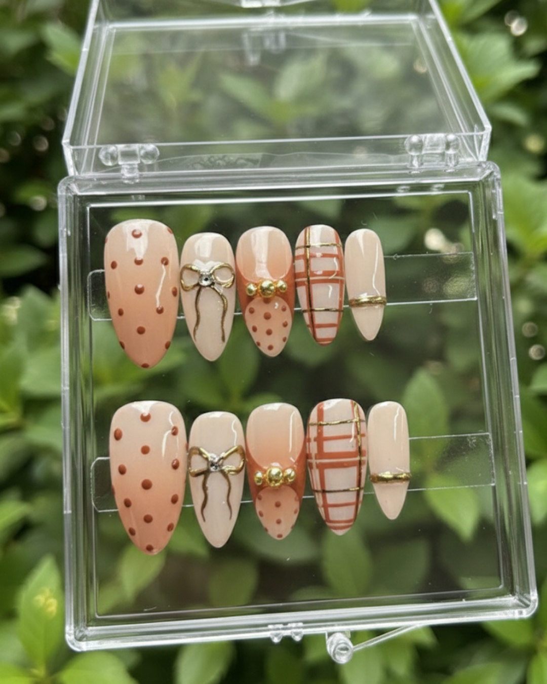 A classy nude-and-peach set with delicate bows, gold accents, polka dots, and chic plaid detailing. Soft, feminine, and perfect for everyday glam.